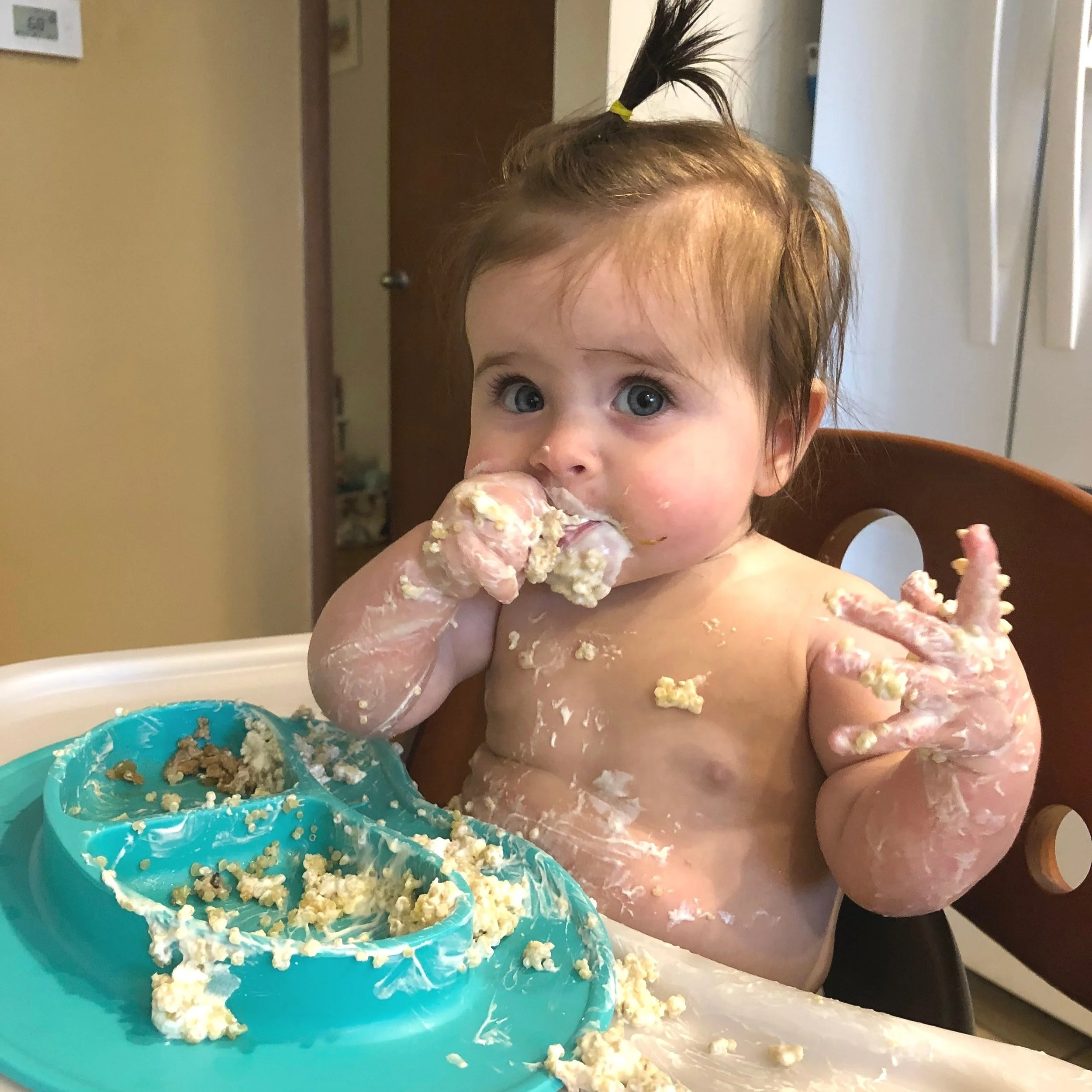 Greta, around 6 or 7 months, eating quinoa with yogurt and ground meat.